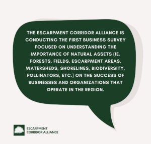 For many years the importance of South Georgian Bay’s natural assets to the region’s businesses and economy has been debated. But data from the businesses and organizations that are the heartbeat of South Georgian Bay was lacking…until now. The Escarpment Corridor Alliance is conducting the first business survey focused on understanding the importance of natural assets (ie. forests, fields, escarpment areas, watersheds, shorelines, biodiversity, pollinators, etc.) on the success of businesses and organizations that operate in the region.